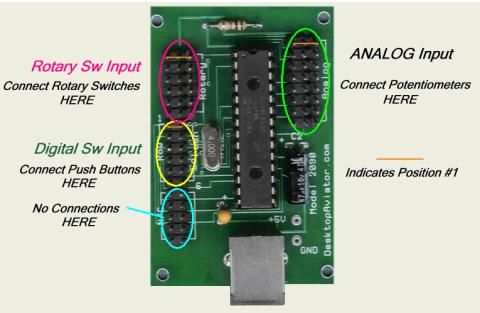 The 2090 was designed to provide three vital functions to any Flight Simmers Avionics Panel; they are Rotary Encoder Switches; Analog inputs from slide or rotary potentiometers and Digital inputs for 20 Push Buttons.